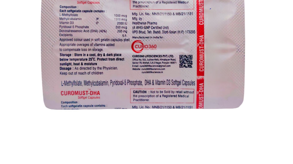 CUROMUST DHA Softgel Capsules are a premium combination of essential vitamins and omega-3 fatty acids designed to support maternal health, fetal brain development, and overall wellness. This advanced formulation contains L-Methylfolate, Methylcobalamin, Pyridoxal-5-Phosphate, DHA, and Vitamin D3 — all in their highly bioavailable forms for maximum absorption and effectiveness.