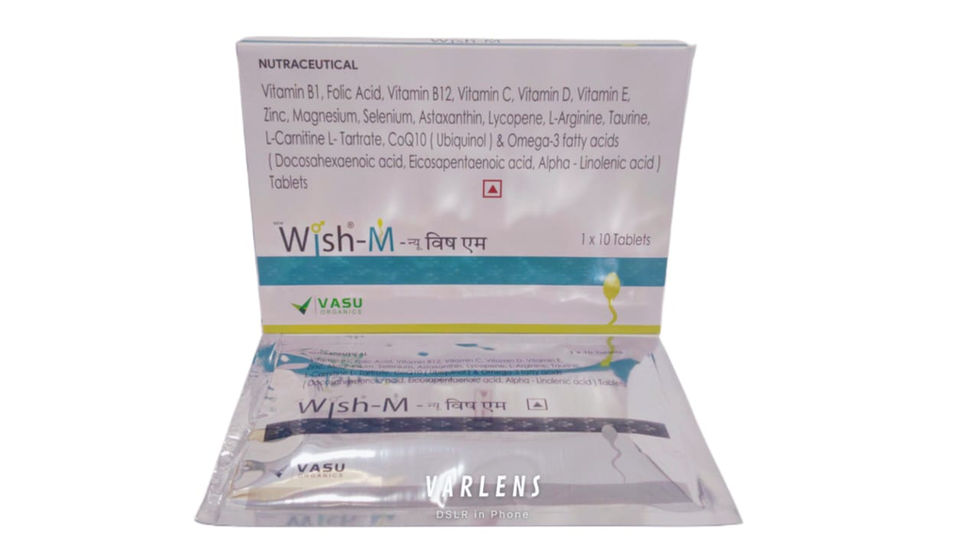 Wish-M Tablets (Vasu Organics) is a so-called nutraceutical. The front gives details that every tablet has several ingredients such as Vitamin B1, Folic Acid, Vitamin B12, Vitamin C, Vitamin D, Vitamin E, Zinc, Magnesium, Selenium, Astaxanthin, Lycopene, L-Arginine, Taurine, L-Carnitine L-Tartrate, CoQ10 (Ubiquinol) and Omega-3 fatty acids (DHA, EPA, Alpha-linolenic acid).