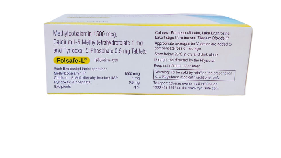 Folsafe-L is a premium nutritional supplement formulated with three essential vitamins that support nerve health, red blood cell formation, and overall wellness. It contains Methylcobalamin 1500 mcg, Calcium L-5 Methyl tetrahydrofolate 1 mg, and Pyridoxal-5-Phosphate 0.5 mg, making it ideal for individuals with Vitamin B12 deficiency, neuropathy, or increased nutritional needs.